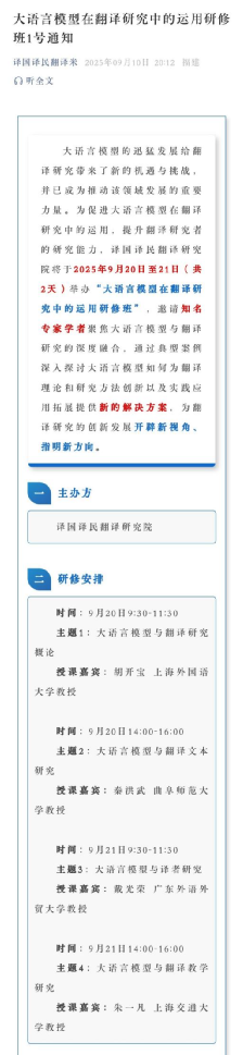 具体信息链接:大语言模型在翻译研究中的运用研修班1号通知https://mp.weixin.qq.com/s/6s2olg70eo92ZFsasUl7aQ