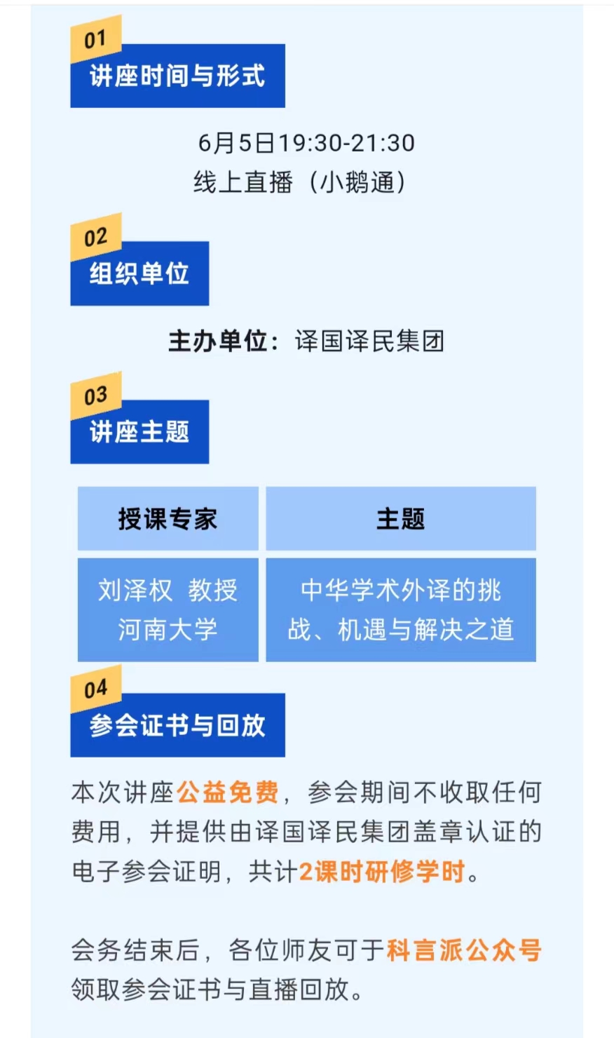 具体信息见链接:免会务费|中华学术外译公益讲座一号通知https://mp.weixin.qq.com/s/CC9FLgozCIPyad3dfuNP2w