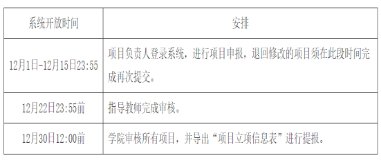 1.2024年12月30日前,学院组织专家进行立项评审,根据评审结果在“燕山大学大学生创新训练计划系统”中完成审核给予推荐立项的项目,并导出“项目立项信息表”,学院推荐后由学校组织审查。