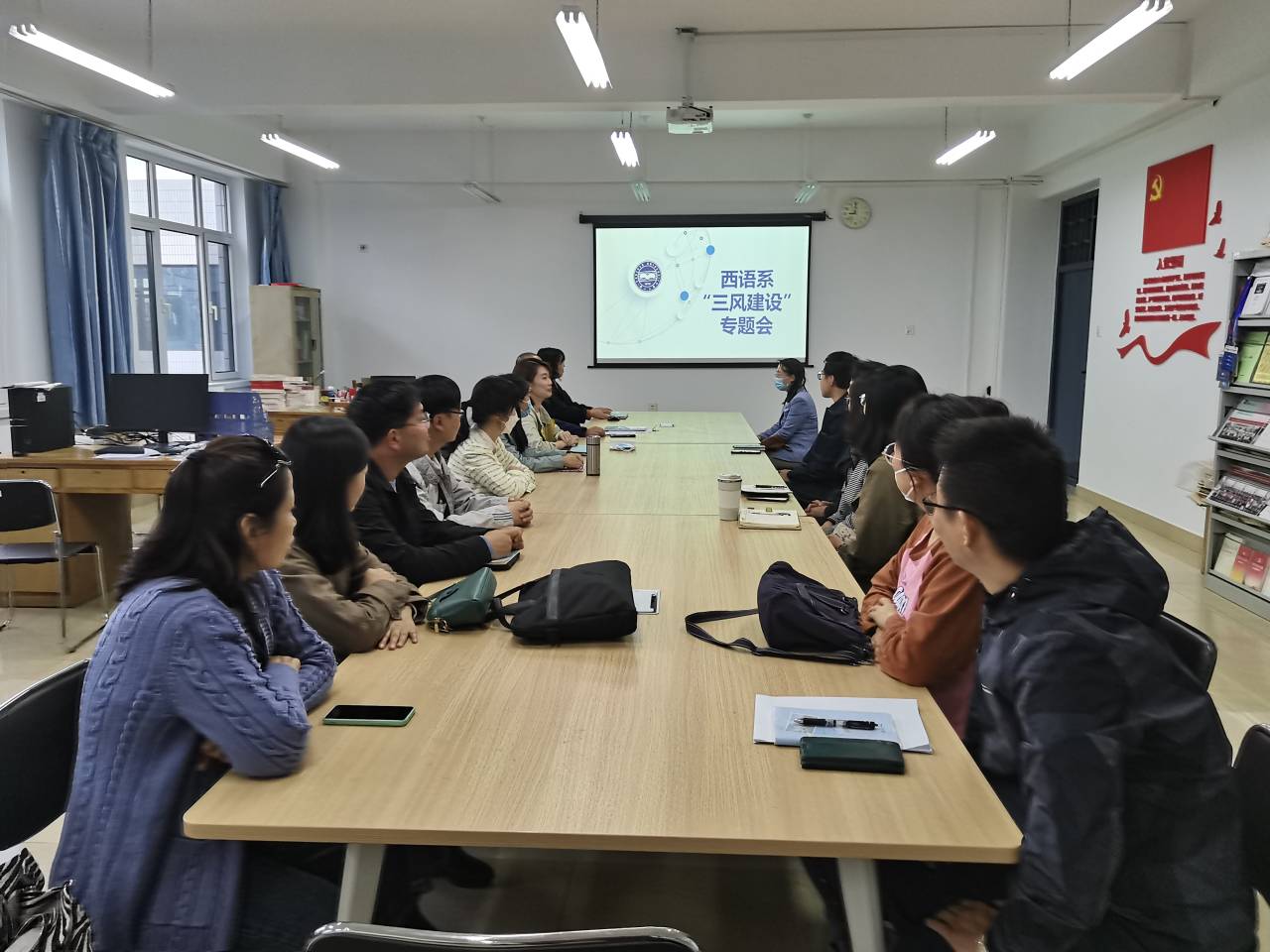 2023年10月18日下午,西语系基层教学组织在人文馆318举行了一场星空平台"三风"建设的专题会议。会议由西语系主任刘立军主持,西语系全体教师参加了此次会议。