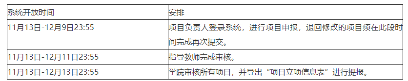 2.通知发布即日起,请申报者认真选题、组队、预研。2023年11月13日至12月9日,请申报者在指导教师指导下填写申报书(附件2)。项目负责人登陆“燕山大学大学生创新创业训练计划系统”,参考学生项目申报操作手册完成填报。学生申报系统开放时间为2023年11月13日10:00—2023年12月9日23:55,请按照时间截点完成相关工作。
