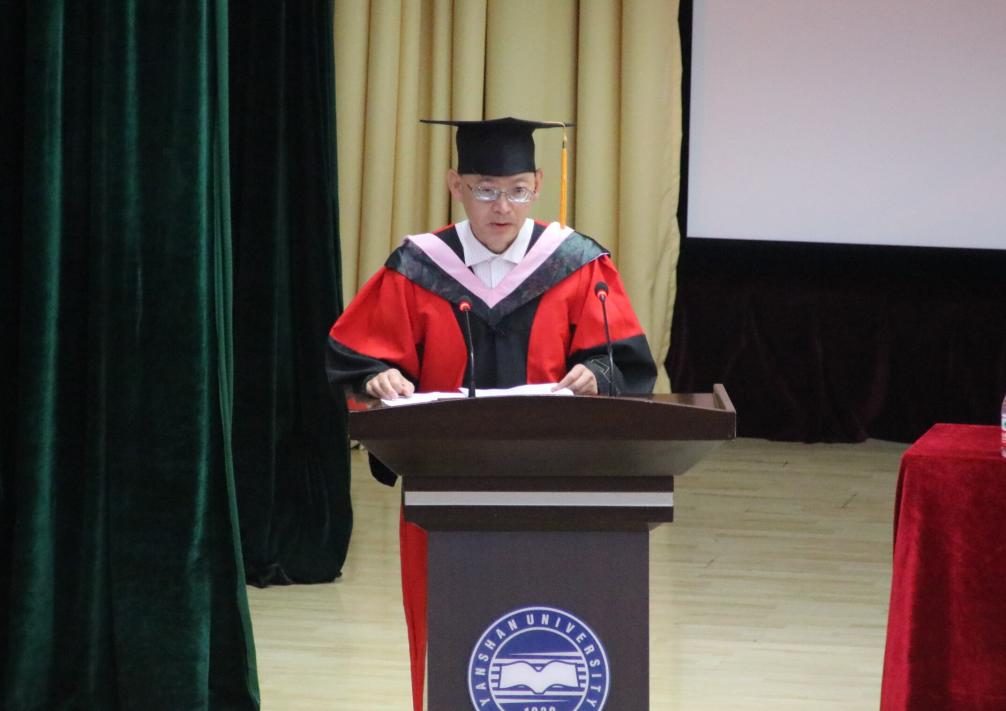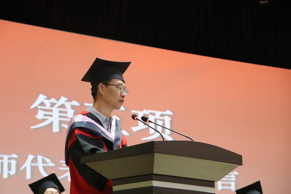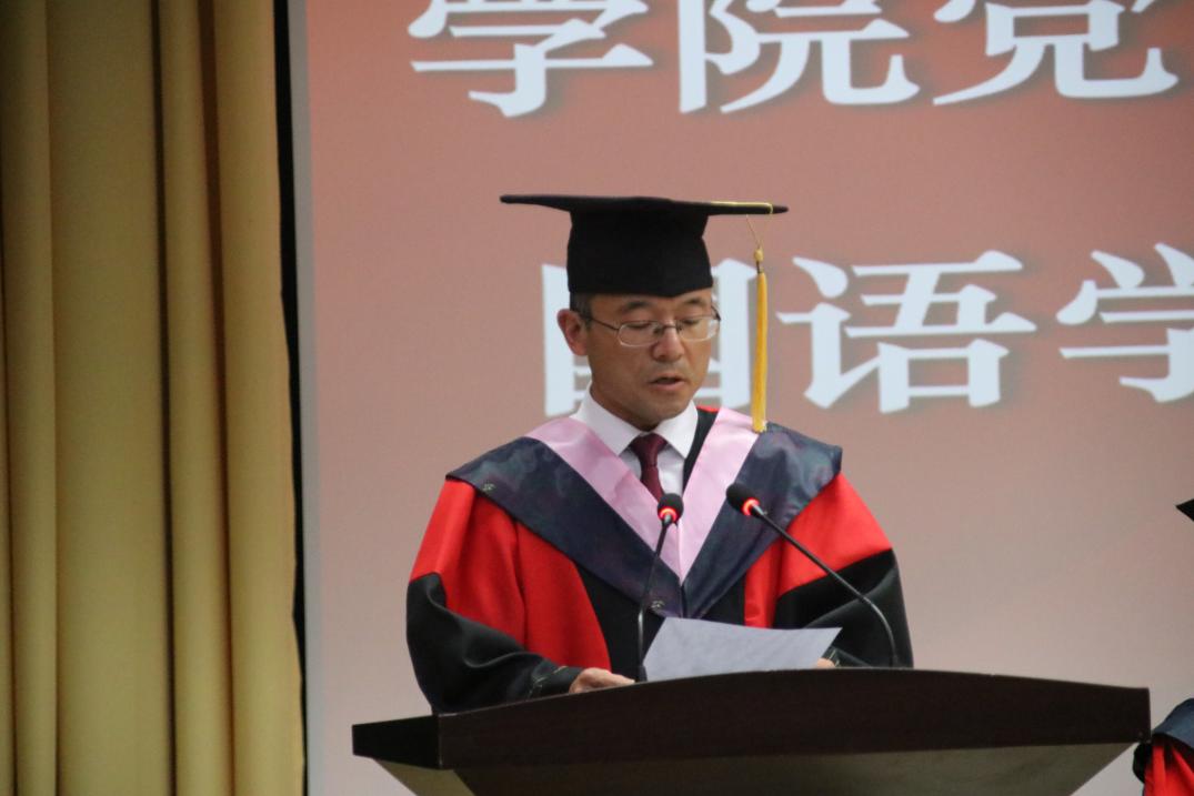 英语系党支部书记张宇代表学院全体教师发言,他鼓励同学们做人要永葆勤学之心,用双脚丈量世界之书、用双手触摸社会之书、用双耳倾听内心之书,将学习贯穿终身。