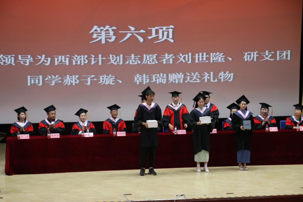 党委书记屈晓阳、院长王林海、副院长赵志刚共同为西部计划志愿者刘世隆、研支团郝子璇、韩瑞赠送礼物。感谢三位同学将青春和热情撒在祖国需要的地方,希望他们在新的岗位再创佳绩,为母校争光,为祖国奉献。