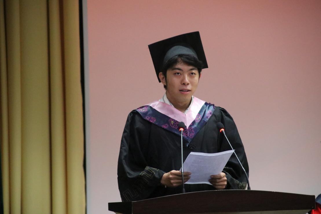 已被推荐至吉林大学攻读硕士学位的2020级日语2班的乔柏霖同学代表毕业生发言。他分享了自己在大学生活中的成长与收获,并表达了对母校的感恩与惜别之情。他代表外院学子承诺,未来用自己的行动践行新时代外语学子的使命担当,用扎实的语言技能与更为宽广的国际视野推动文化交流与互鉴,为祖国的发展贡献自己的力量。
