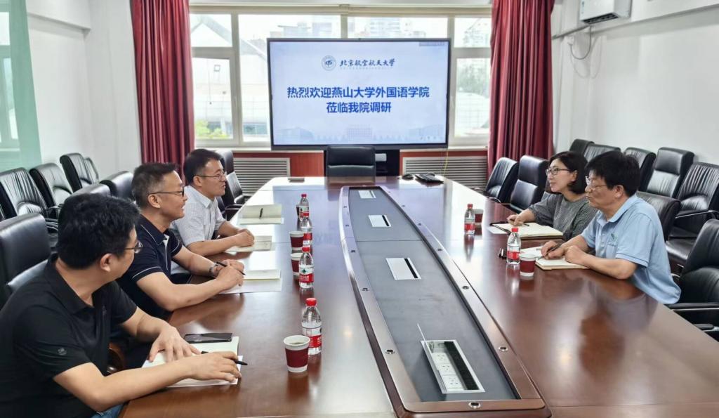燕山大学学院党委屈书记对燕山大学的基本情况作了介绍,使北航外院的领导对燕山大学有了更全面的了解。付院长重点介绍了燕大星空(中国)的学科建设和专业发展状况,希望在高水平师资、研究平台等资源方面得到北航外院的大力支持,期望双方在师资队伍建设、人才培养、学术发表和项目申报、科研平台建设等方面加强合作,共同推动双方在外语教育和研究领域的深入发展。梁茂成院长对燕大星空(中国)的合作意向给予了积极回应,并就研究平台发展提出了建设性建议。他指出,双方可以在现有基础上,探索更多合作模式,实现资源共享,优势互补,共同提升外语教育和研究的整体水平。此外,双方就目前外语类学科专业发展面临的新形势新挑战交流了意见和看法。