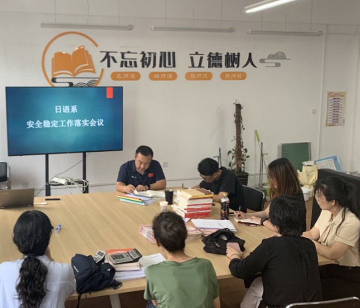 7月4日下午,日语系召开安全稳定工作落实会议。刘洪岩传达了上级有关安全稳定工作的精神,并结合本系实际情况,对安全稳定重点工作提出了具体要求。他指出要加强传统和非传统领域安全的防范意识和能力,对网络安全及其他意识形态领域安全做到信息畅通,密切关注并引导专业学生思想动态,树立底线思维,提升应急处置能力。会议还对暑期安全排查作出工作安排。