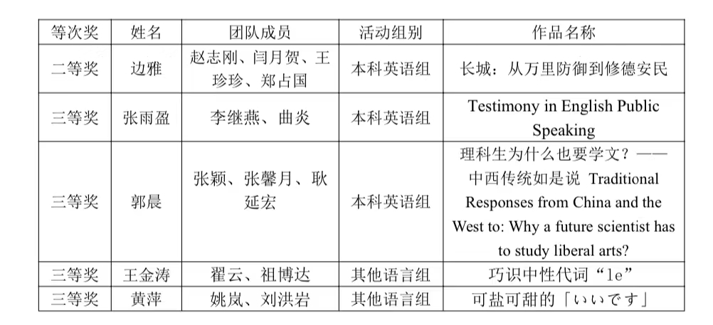 2024年8月,2024年外语微课优秀作品征集与交流活动省级评选结束,我校有5个团队参加,获得了优异成绩。其中边雅团队的《长城:从万里防御到修德安民》作品获得了省级二等奖,张雨盈团队、郭晨团队、王金涛团队、黄萍团队获得了三等奖。