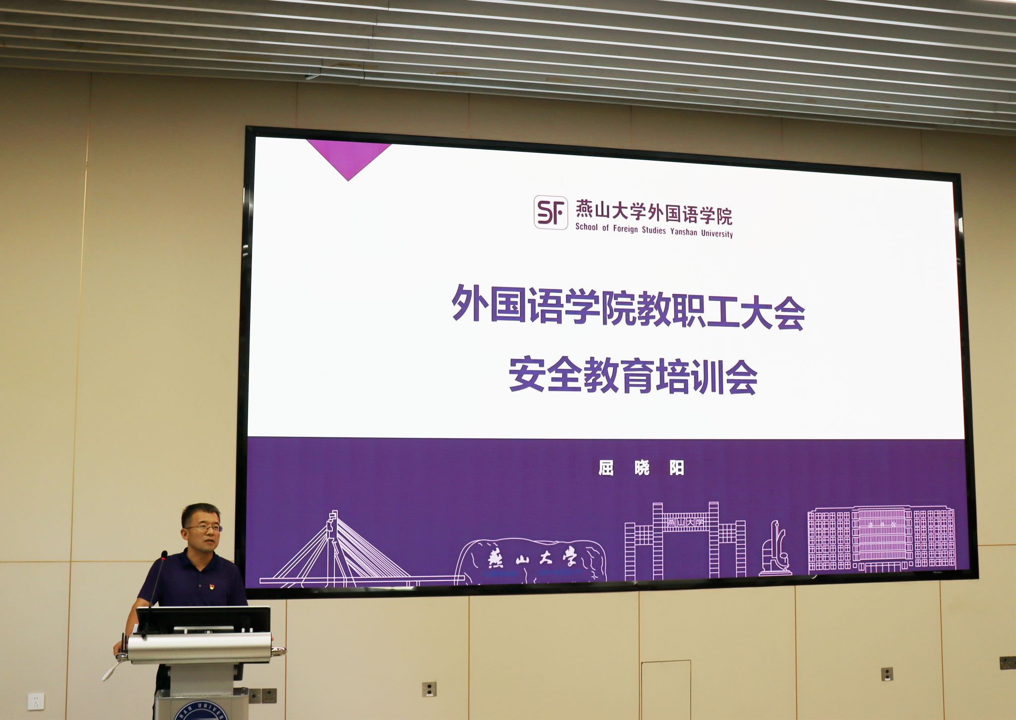 党委书记屈晓阳从党风廉政建设、师德师风建设、安全稳定工作、意识形态工作四方面提出了具体要求:一是要认真学习领会上级有关精神,不断提高思想认识和工作站位;二是要深入谋划和积极推进,狠抓末端最后一公里的贯彻和落实;三是要对安全稳定工作常抓不懈,为内涵式高质量发展营造和谐稳定的环境。随后,屈晓阳书记对全体教职工进行了安全教育培训,从国家安全、消防安全、防溺水、出行安全、用电安全、防诈骗六个方面开展安全宣传教育,提升教师安全防范能力。最后,屈晓阳书记希望全院教师尽快从假期休闲模式切换到紧张有序的工作模式,调整好工作、学习和生活的节奏,使身心迅速进入正常的工作状态,在校党委的坚强领导下,在学院党政领导带领下,拼搏实干、努力奋斗、奋勇争先,为学校加快推进“双一流”建设和学院内涵式高质量发展贡献我们外语人的力量!