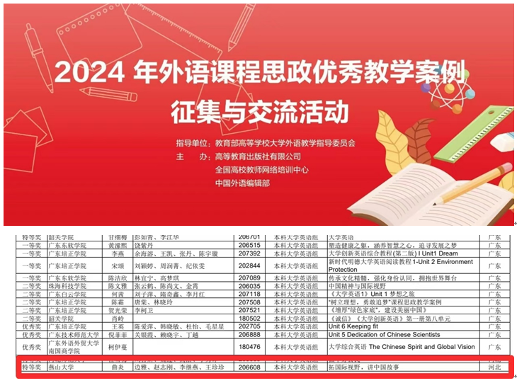 2024年10月,2024年外语课程思政优秀教学案例征集与交流活动省级评选工作落下帷幕。星空(中国)曲炎老师团队的作品——《拓国际视野,讲中国故事》——经过精心准备,反复打磨,在众多参赛作品中脱颖而出,荣获河北省特等奖。