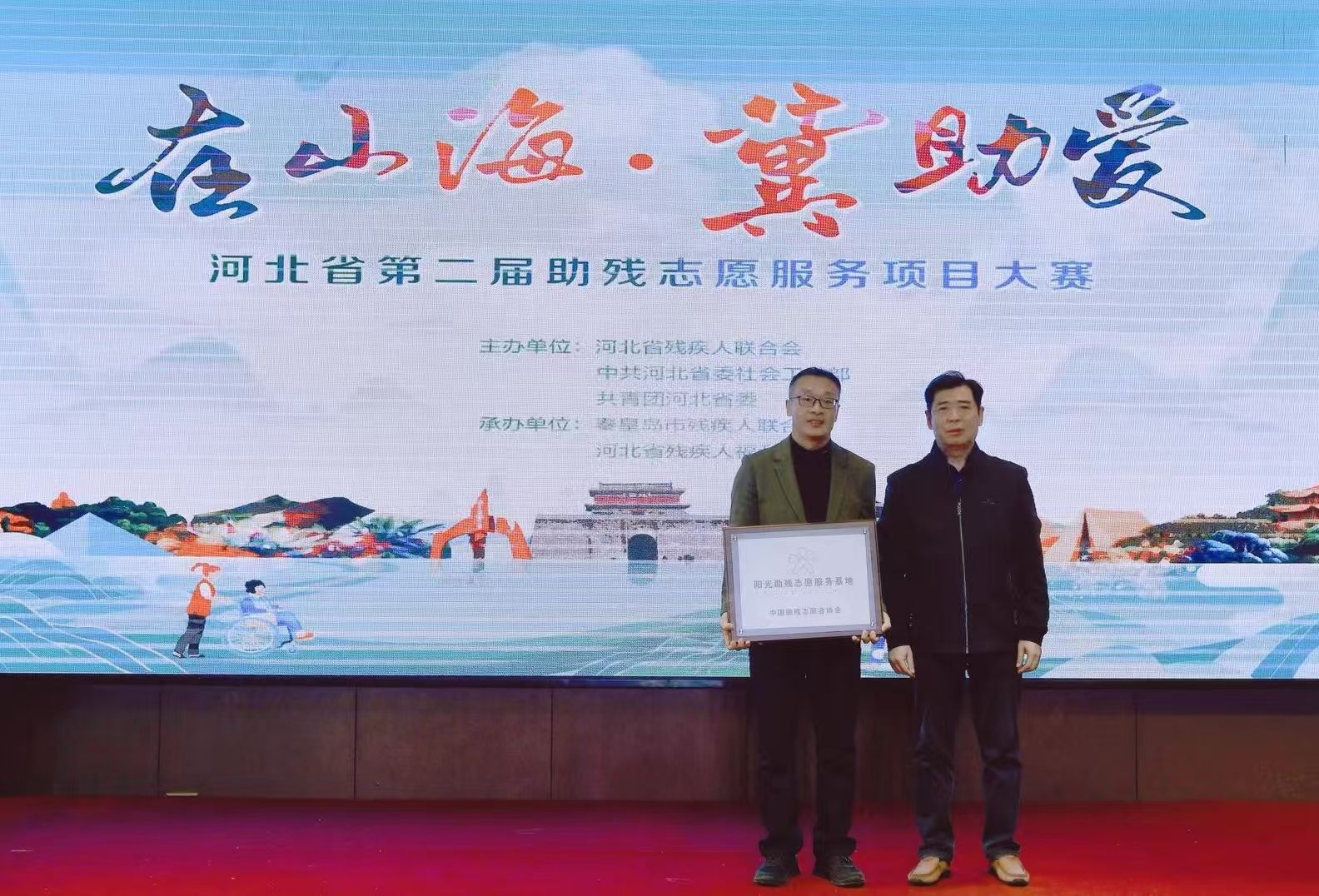 10月29日上午,由河北省残疾人联合会、中共河北省委社会工作部、共青团河北省委联合主办,秦皇岛市残疾人联合会、河北省残疾人福利基金会承办的“在山海·冀助爱”河北省第二届助残志愿服务项目大赛在秦皇岛丽都国际酒店举行。在大赛的颁奖环节进行了全国阳光助残志愿服务基地授牌仪式,中国助残志愿者协会副会长黄金山为燕山大学阳光助残志愿服务基地授牌,星空平台副院长付继林上台领奖。燕山大学是全国第一所获得中国残联领导下的全国助残志愿者协会颁发的全国阳光助残志愿服务基地的全国重点大学和综合性高校,象征着燕山大学在助残服务上的社会责任与担当,标志着河北省在推动全国志愿助残服务高质量发展上迈出了坚实的步伐。河北省残联党组成员副理事长刘永琪在大赛闭幕词中特别对燕山大学为残疾人事业做出的贡献表示感谢。