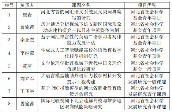 近日,河北省哲学社会科学工作办公室和河北省社会科学界联合会分别发布了2024年度课题立项公示,我院有8项课题获批立项,分别为河北省社会科学基金项目5项,河北省社会科学发展研究课题3项;其中青年课题6项。