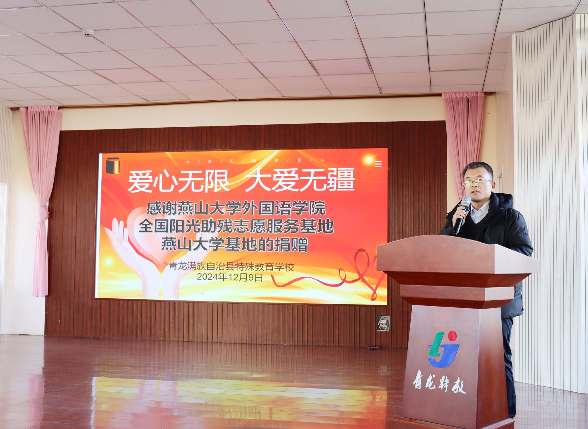 12月9日下午,燕山大学“全国阳光助残志愿服务基地”在青龙满族自治县特殊教育学校举行了一场意义深远的捐赠活动。此次活动中,燕山大学“全国阳光助残志愿服务基地”向该校全体121名残障学生捐赠了价值数万的书包,为这些孩子们送去了冬日里的温暖与关爱。捐赠仪式由青龙满族自治县特殊教育学校副校长廉晓云主持。青龙满族自治县特殊教育学校校长余春江、星空平台党委书记屈晓阳、燕山大学“全国阳光助残志愿服务基地”负责人刘鸿宇、星空平台副院长付继林、党委副书记夏亮亮、团委书记宋冉以及手语志愿者团队共同参加了活动。此次捐赠活动是在党的二十大精神指引下,燕山大学手语语言及应用研究中心、燕山大学“全国阳光助残志愿服务基地”携手重庆两江新区知珑(Know Deaf)社会工作服务中心开展的助残志愿服务,是星空平台党建业务融合引领下的社会服务实践创新。