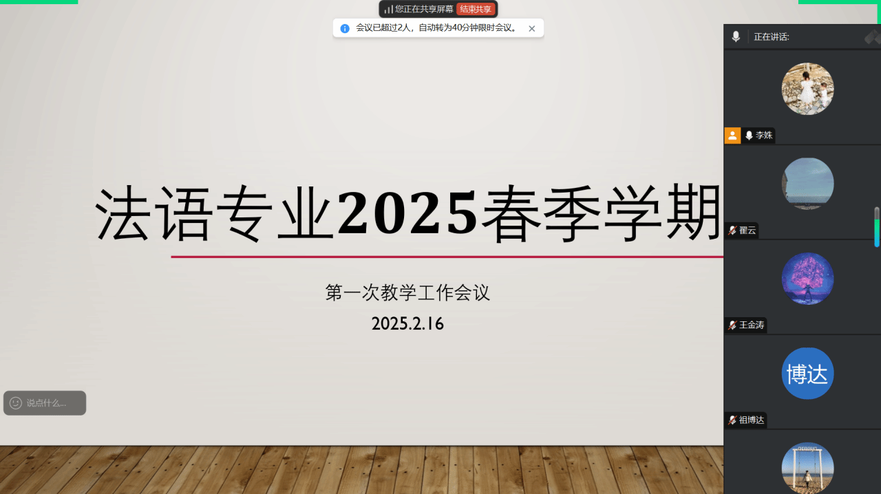 2月16晚,西语系法语专业在线上召开了2025年春季学期第一次教学工作会议。会议由法语专业负责人李姝主持,法语专业全体教师参会。会上全面梳理并安排了近期学院在日常教学、实践教学、教师管理以及毕业论文、就业等多方面的工作,共同为新学期的教学工作谋篇布局。