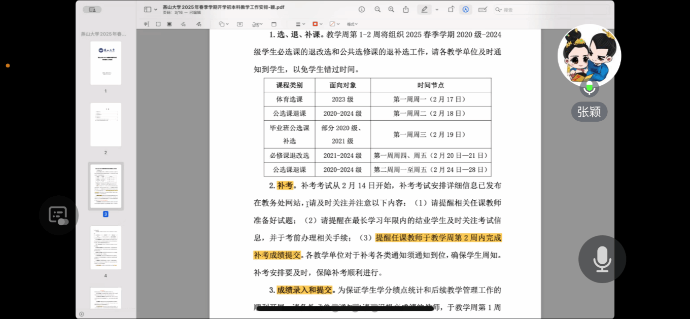 随后,张颖老师逐一介绍了补考、成绩录入和提交、教学日历提交、教材领用以及教改项目申报等关键事项。她强调,补考工作要严格按照学校规定进行,确保公平公正;成绩录入和提交要及时准确,避免延误学生学业进程;教学日历的提交要规范,以便学校对教学工作进行整体调度;教材领用要合理安排,确保每位学生和教师都能及时获得所需教材;教改项目申报要积极踊跃,鼓励教师们探索创新教学方法,提升教学质量。