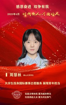 周慧秋,女,汉族,2003年8月出生,中共预备党员。2021年至今,她不断提升自身专业能力,积极参与各类社会公益活动,致力于投身志愿服务,多次作为国际赛事志愿团队核心成员带领近千余名志愿者为全球运动员提供服务,并在10余项国际赛事中承担交替传译工作,用语言传播中国声音,促进跨文化交流;她深入校区、社区、景区等地,用语言赋能党课,创建“党建+双语”党课新形式,开展特色双语党课60余场,助力红色文化对外传播;她长期关爱老年群体,走进多家养老院帮助老年人提升晚年生活质量;参与支教项目,助力教育公平,现已入选我校研究生支教团,将于今年9月奔赴西部支教,为社会发展贡献青春力量。