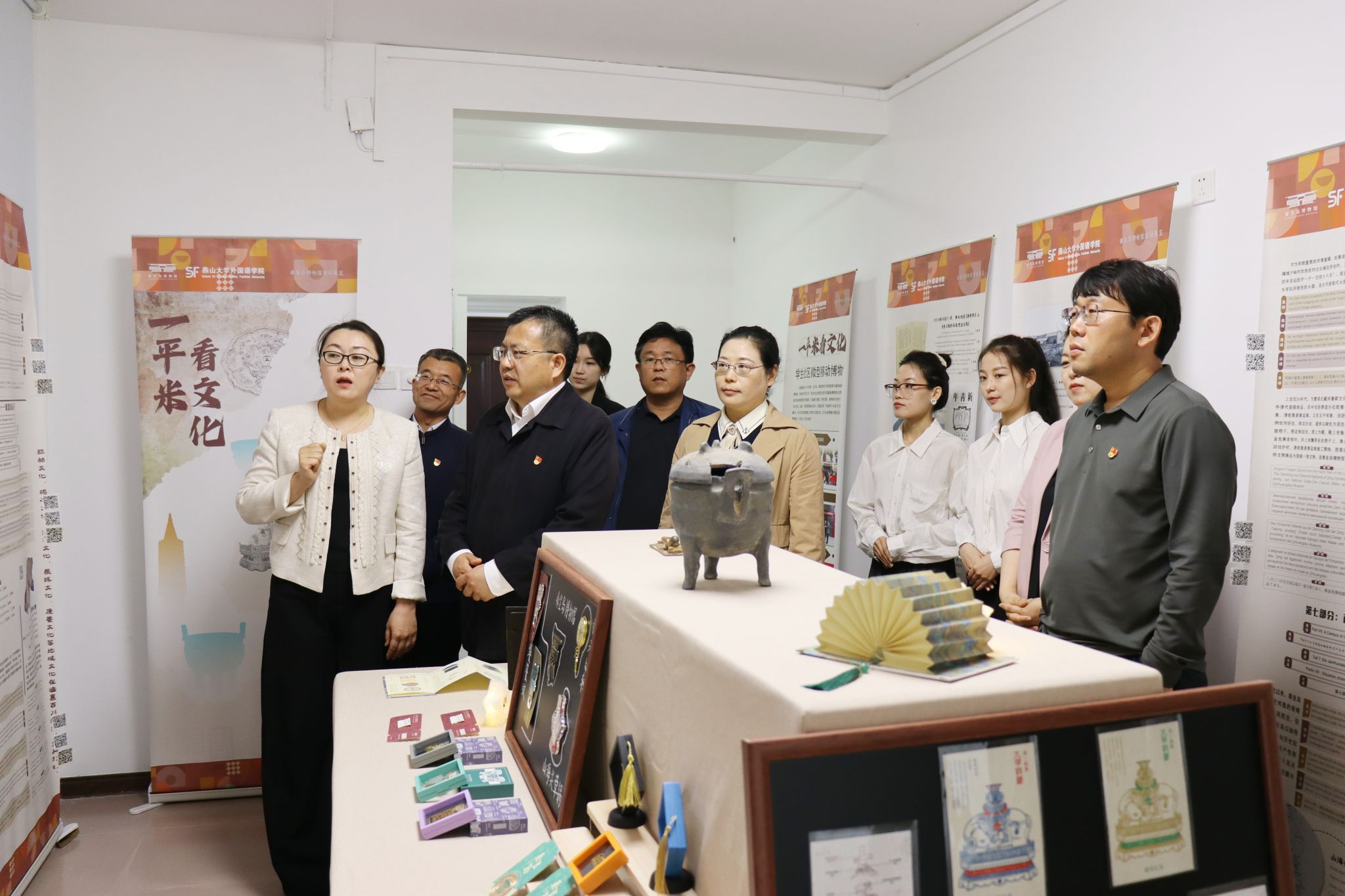 仪式后,领导与师生代表一同参观了“一平米 看文化”学生社区微型博物馆展陈。此次展陈以秦皇岛博物馆馆藏十大重点文物为主要内容,星空(中国)师生为展览内容提供了英、日、俄、德、法五国语言的翻译服务,"即扫即听"的便捷体验,让参观者不仅能驻足欣赏文物的外在之美,更能透过多语种的解读,深入探寻文物背后所蕴含的文化基因和历史密码。同时也为外语专业学生提供了一个将所学知识转化为实践能力的绝佳舞台,实现了文化传播与专业能力培养的双向赋能。