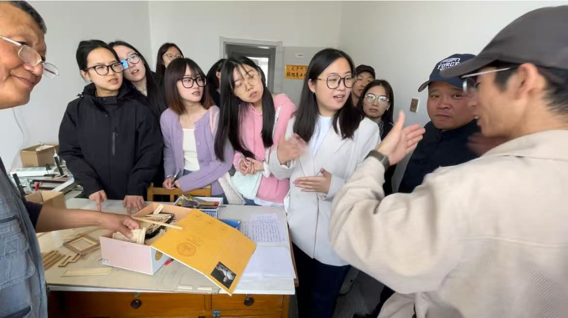 随后,师生们来到了张旭亮老人的无声竹艺工作室。张旭亮老人是一位聋人艺术家,他的竹艺作品摆满了整个屋子。这些作品生动还原了山海关古城建筑,其精细程度令人叹为观止。城楼与城墙之间的部件可以拆卸,楼门被设计成灵活推拉的样式,甚至连城墙上的花纹都是张旭亮老人巧妙设计而成。尽管语言不通,但张旭亮老人通过精湛的竹艺作品与师生们进行了一场无声的交流。他向大家展示了作品的细节,并用手语和表情讲述创作过程中的挑战与克服的困难,传达了对传统工艺的热爱。师生们被老人的专注与热情深深感染,对他的作品赞不绝口,同时也对手语作为沟通桥梁的力量有了更深刻的认识。
