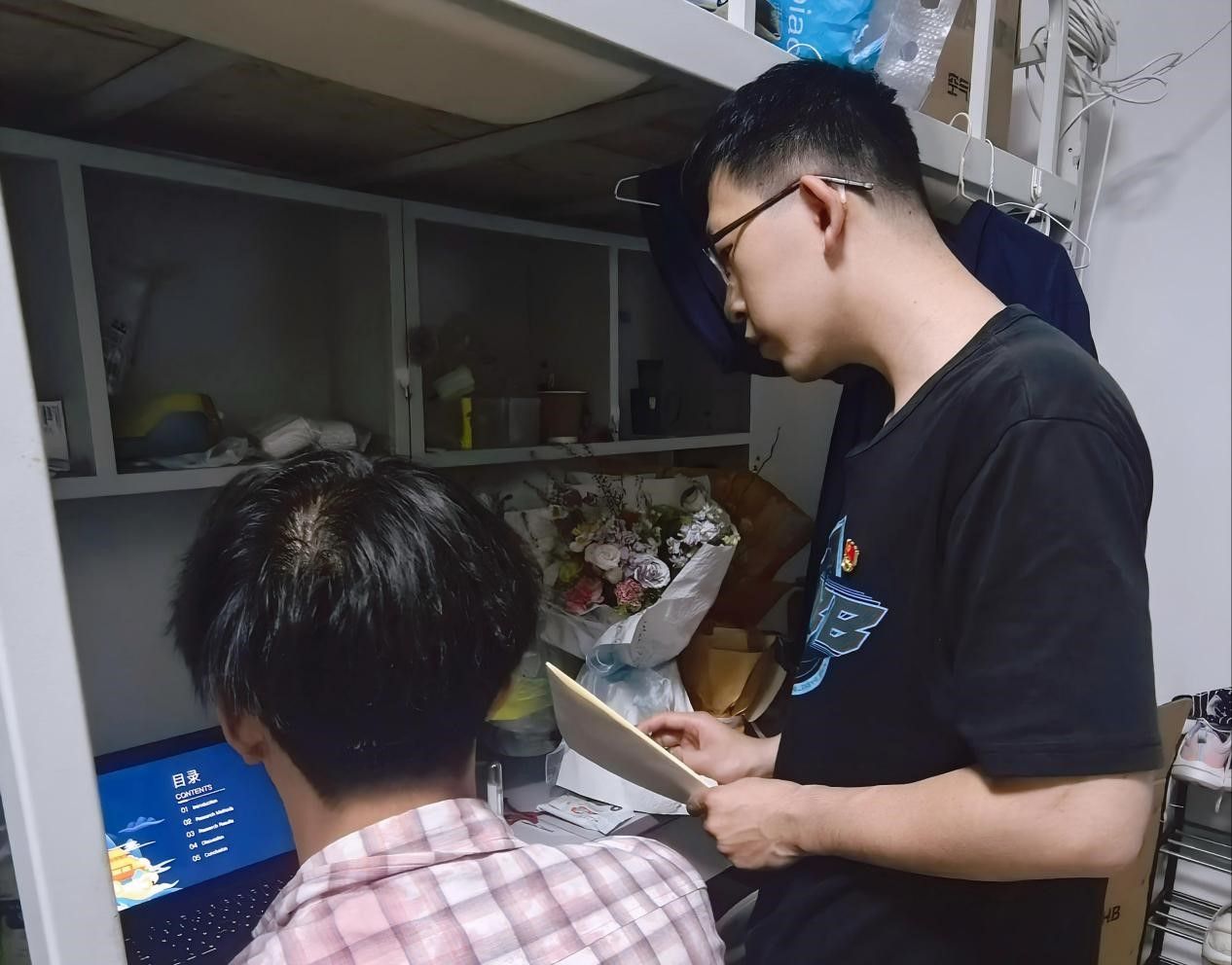 学院设立“党员消防安全检查流动安全服务岗”,党员们佩戴党员党徽,轮流值守,以严谨细致的态度对学生宿舍区域的消防设施、用电安全、吸烟情况等进行全面检查。发现安全隐患后,他们第一时间记录并上报,积极协调相关部门整改。同时,党员们化身安全宣讲员,结合党的安全生产理念,通过真实案例讲解、消防器材操作演示等方式,向同学们普及消防安全知识,切实提高学生的安全意识与应急处理能力。在五公寓、七公寓内,毕业生党员们带头开展宿舍公共区域清理整顿活动,清理楼道杂物、规范物品摆放、排查安全隐患,以实际行动践行为人民服务的宗旨,为同学们营造安全、整洁的居住环境。