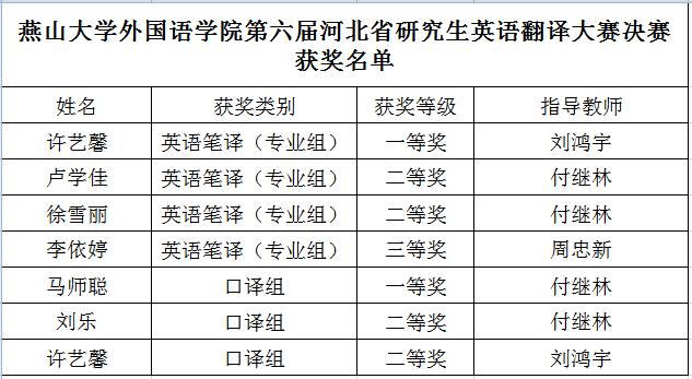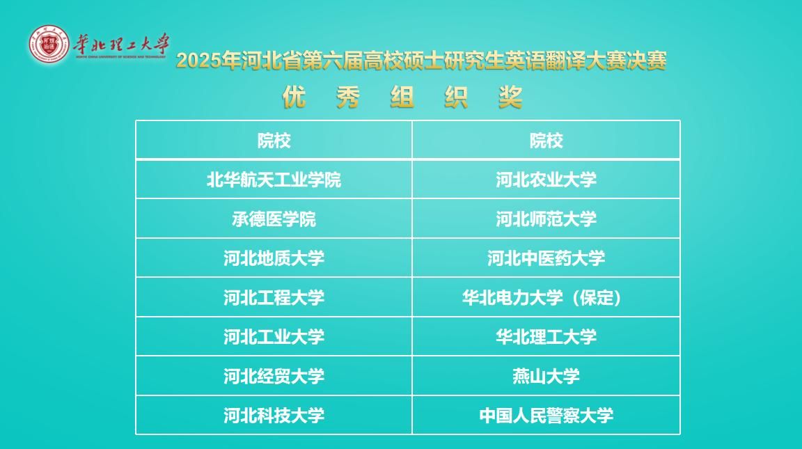 2025年7月14—15日“河北省第六届高校硕士研究生英语翻译大赛”决赛在华北理工大学举行。我院6名英语专业研究生通过初赛、复赛两个阶段的选拔成功晋级决赛,同来自全省近30所高校的200余名选手激烈角逐全部获奖。其中英语笔译(专业组)一等奖1个,二等奖2个,三等奖1个;英语口译组一等奖1个,二等奖2个。我院还获得河北省教育厅学位管理与研究生处颁发的该赛事“优秀组织奖”荣誉称号。