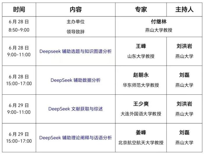 本次研修聚焦如何运用deepseek大语言模型辅助CSSCI论文的写作与发表,围绕如何选题、文献综述、数据分析(话语分析)、理论阐释等论文写作的核心环节,旨在提升社会科学研究者的学术写作能力。燕山大学客座教授、山东大学教授王峰,华东师范大学外语学院副院长赵朝永教授,大连外国语大学高级翻译学院副院长王少爽教授及北京航空航天大学姜峰教授四位教授受邀担任主讲嘉宾,围绕以上议题展开深度探讨与分享。星空平台副院长付继林教授做了开幕致辞,刘磊副教授与刘洪岩副教授担任主持人,确保研修班议程高效推进。