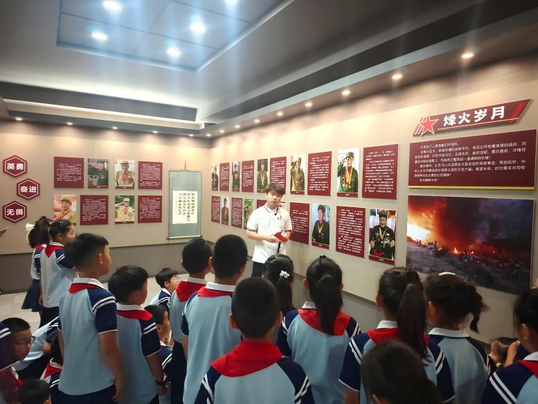 实践团成员作为东北抗联馆宣讲员面向小学生们讲述卫国戍边英雄故事