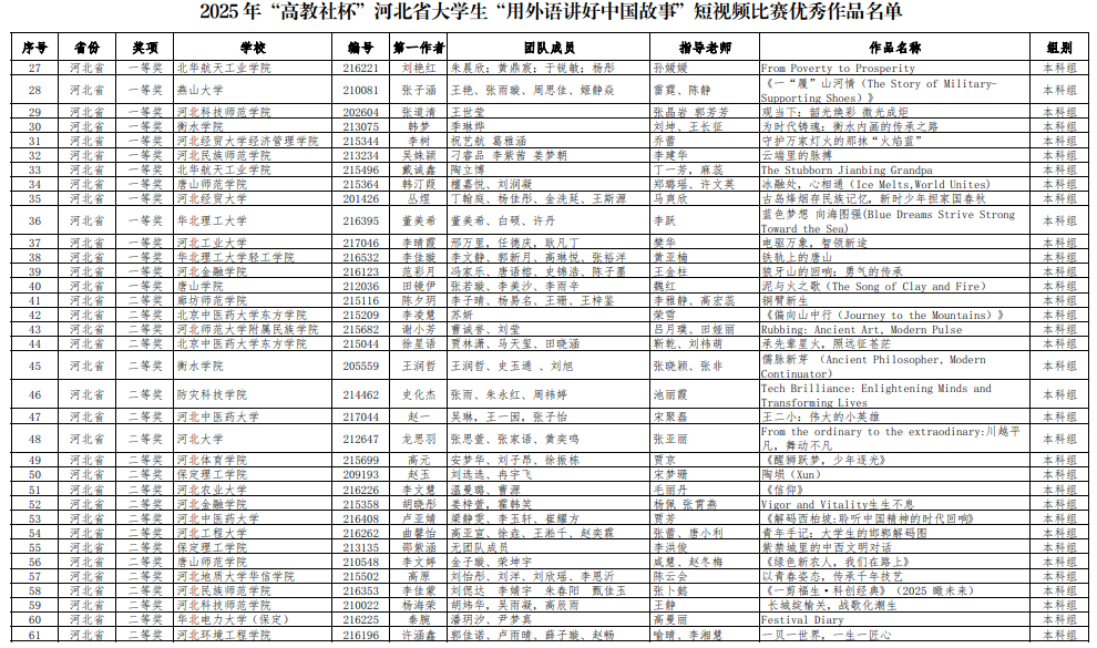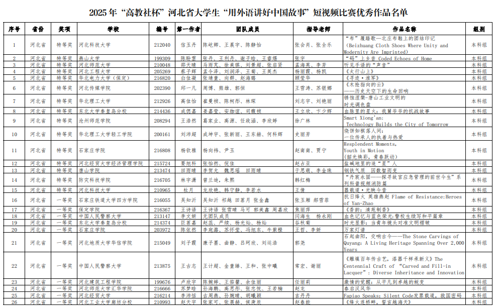 8月12日,2025年“高教社杯”河北省大学生“用外语讲好中国故事”短视频比赛落下帷幕,我校陈盼雲团队作品(指导教师张宇)荣获特等奖、张子涵团队作品(指导教师雷霆、陈静)荣获一等奖,奖项级别再创历史最佳,荣获特等奖的作品将代表河北省参加全国优秀作品评选活动。