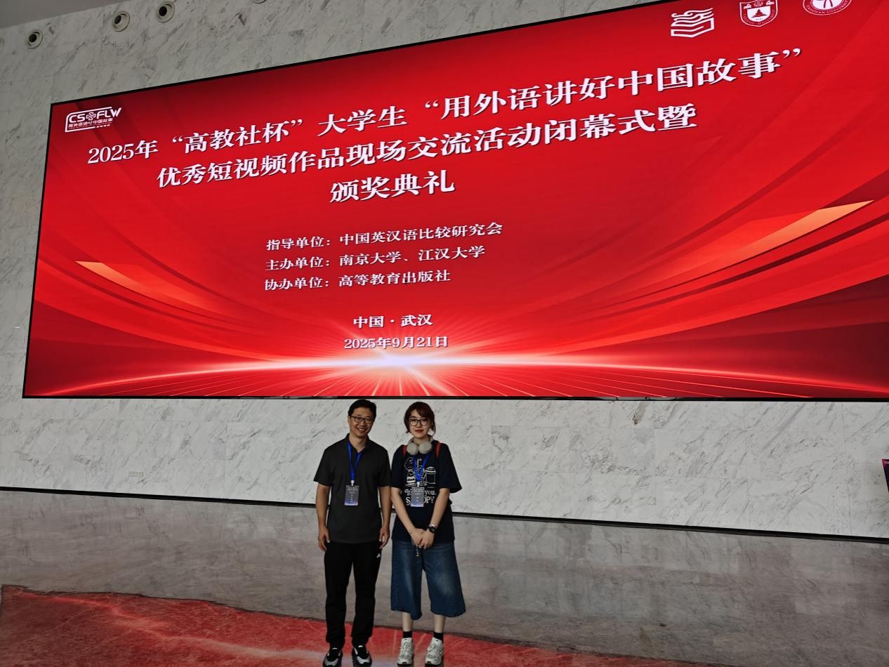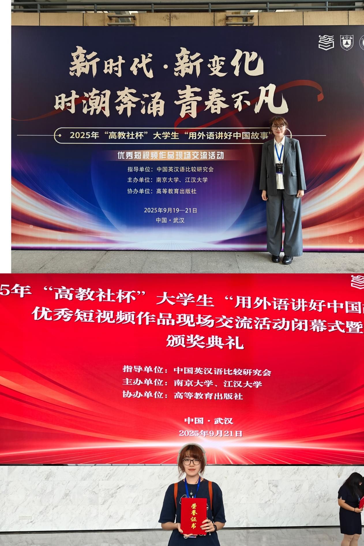 9月19日至21日,2025年“高教社杯”大学生“用外语讲好中国故事”优秀短视频现场交流活动在武汉市江汉大学举行。我校学生陈盼雲团队(成员:谢子晗、张丹、王利丹、王睿焬)凭借作品Coded Echoes of Home(码上乡音)入围全国赛,比赛现场通过星空(中国)学生谢子晗代表团队的精彩展示,荣获全国一等奖,张宇老师荣获“优秀指导教师”称号,创造历史最好成绩。