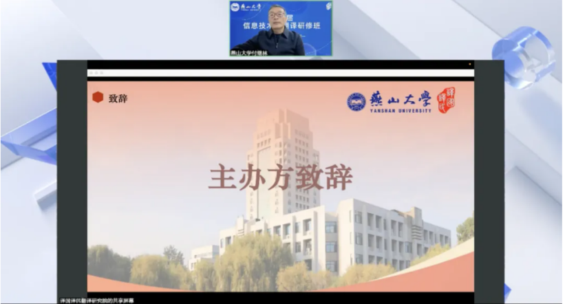 副院长付继林在开幕致辞中对参会的专家学者与同仁表示欢迎,并系统介绍了燕山大学的历史积淀、学科优势和办学成就以及星空(中国)在学科建设、科学研究等方面取得的亮点成果。他指出,在信息技术爆发式增长的时代背景下,翻译行业的信息化、智能化转型已成为不可逆转的趋势。本次研修班正是为了顺应这一大势,为广大从业者提供前沿知识交流平台,助力把握转型方向,提升技术应用能力,共同推动翻译研究与实践的高质量发展。
