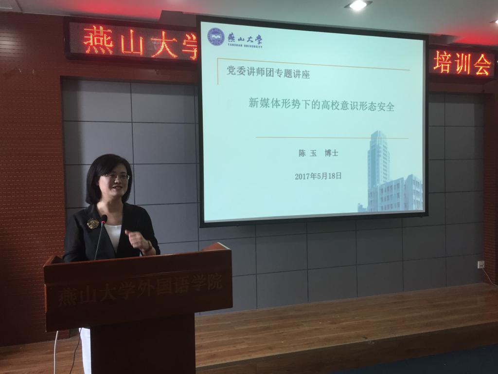 2017年5月18日下午,学院邀请校党委讲师团陈玉老师进行了一场名为《新媒体形势下的高校意识形态安全》的专题讲座。讲座由学院党委书记严冰主持,学院全体师生党员参加了本次学习培训。