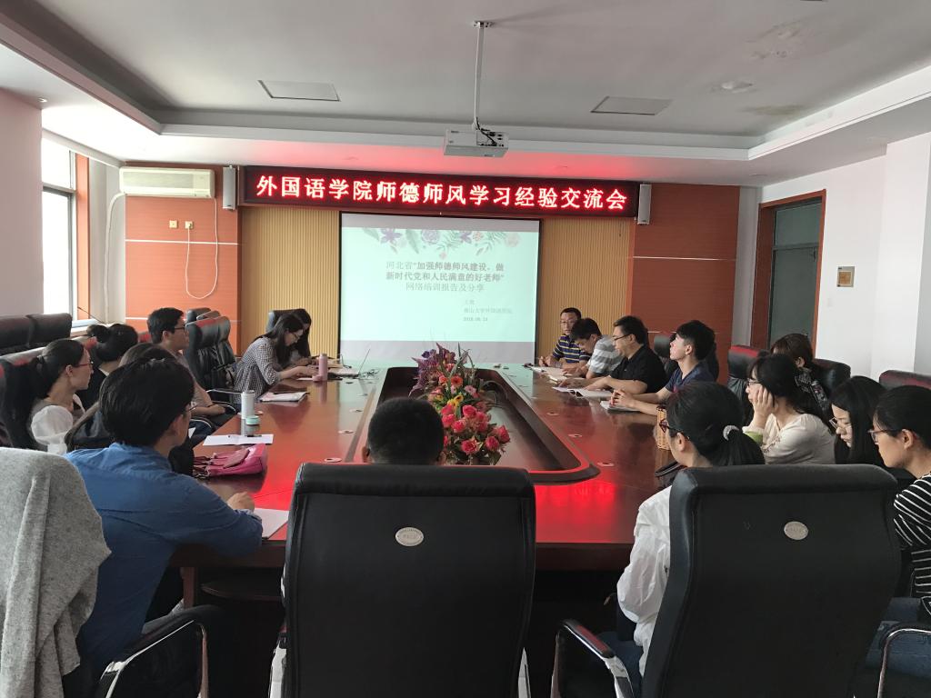 2018年6月13日,我院在人文馆417会议室召开师德师风学习经验交流会,邀请学院2018年河北省“加强师德师风建设,做新时代党和人民满意的好老师”网络培训班的学员王爽老师与边雅老师就培训内容做报告及分享。院党委书记严冰,副院长付继林,副书记王兵及院属各系室的青年教师参加了座谈。