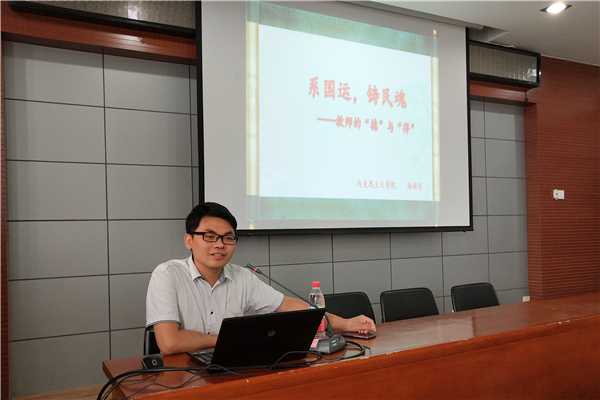 6月22日下午,我院邀请校讲师团成员、马克思主义学院杨新宾老师做了题为《系国运、铸民魂——教师的“德”与“得”》的讲座,全院教师参加了讲座,讲座由我院党委书记严冰主持。