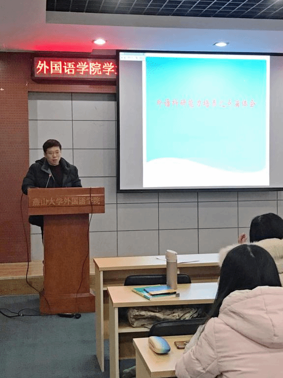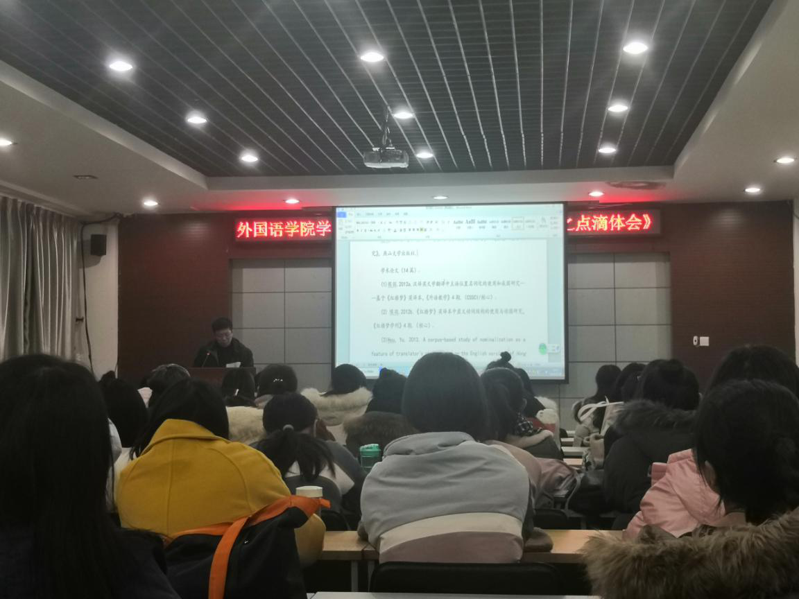 2019年11月28日下午16:00,我院侯羽老师在外语学院报告厅为学院师生做了《外语学术研究能力培养之点滴体会》的学术讲座。包括学院教师及研究生等共计80余人参加了讲座。