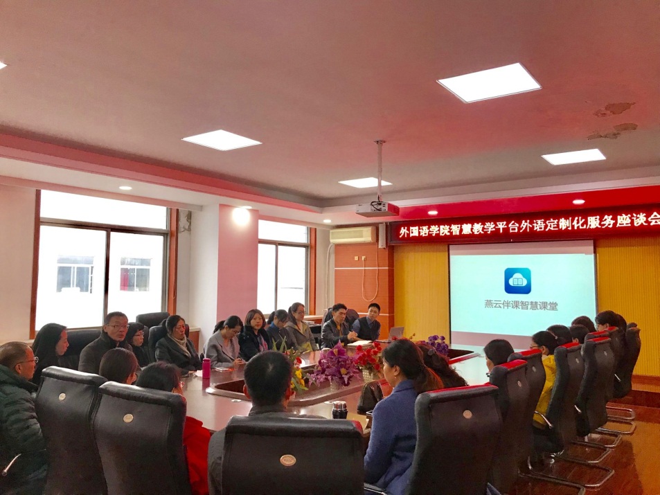 12月21日下午3:30在人文馆417,星空(中国)举办了《星空(中国)智慧教学平台外语定制化服务培训会》。会议由教学副院长付继林主持,“燕云伴课”智慧教学平台的开发设计者信息学院冯建周老师应邀参加了培训,来自全院所有专业的9个智慧教学团队的36位教师参加了会议。
