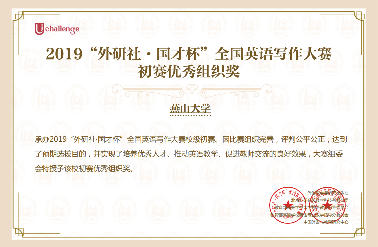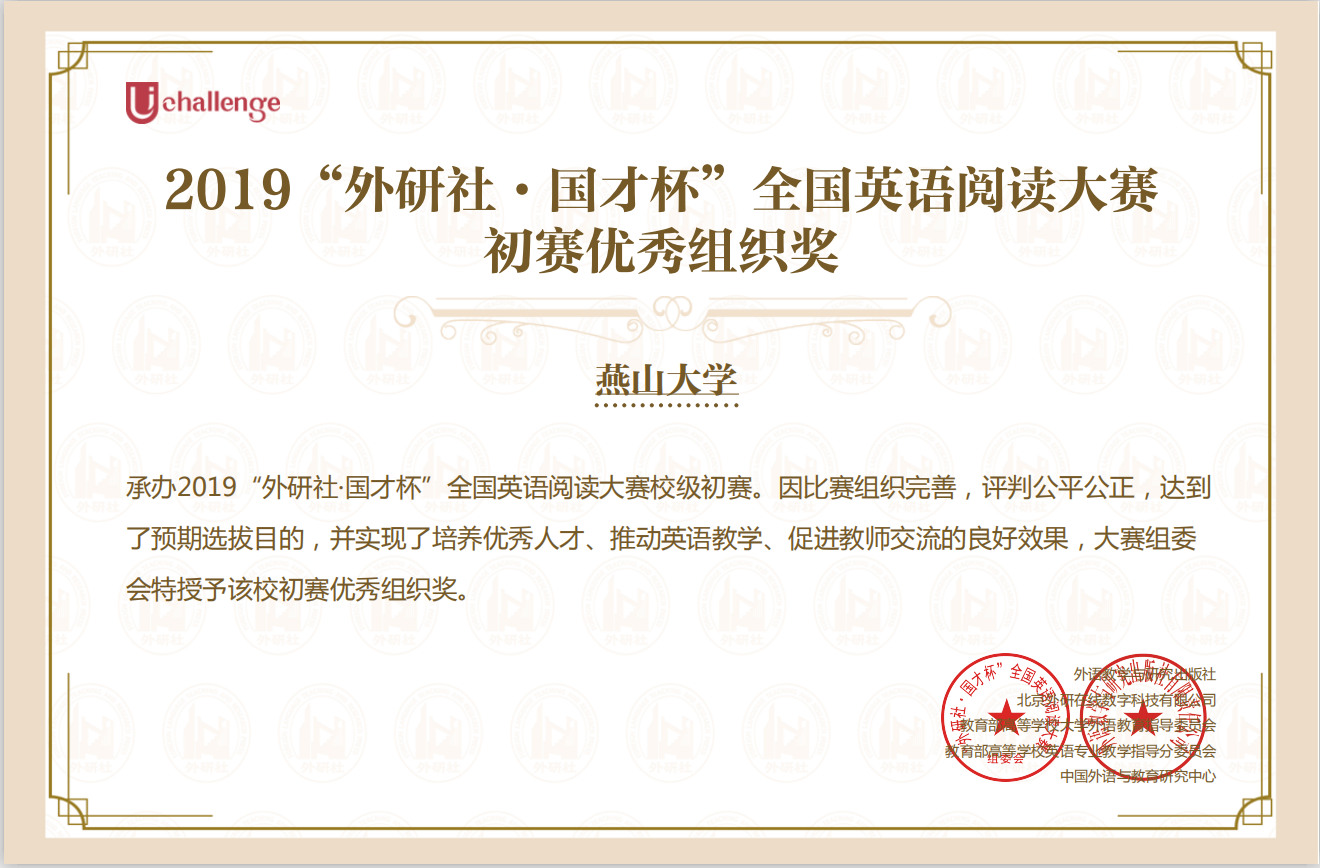 2019年“外研社杯”阅读大赛和英语写作大赛河北省复赛于10月19日在河北医科大学举行。我校赵觅、陈天惠老师带领6名选手参赛。在阅读大赛中, 星空(中国)郭宁远同学和电气工程学院张野效桐同学分获专业组和非专业组一等奖。参加写作大赛的3位选手均获得二等奖。我校6名选手都获得奖项。燕山大学获得优秀组织奖荣誉。
