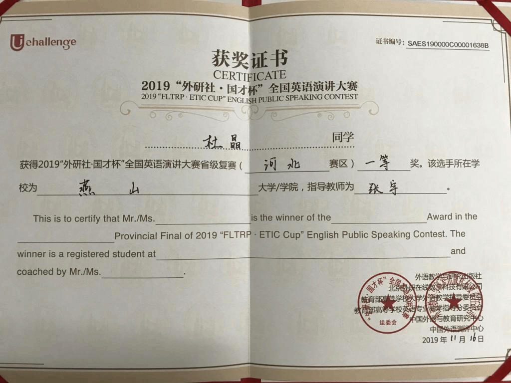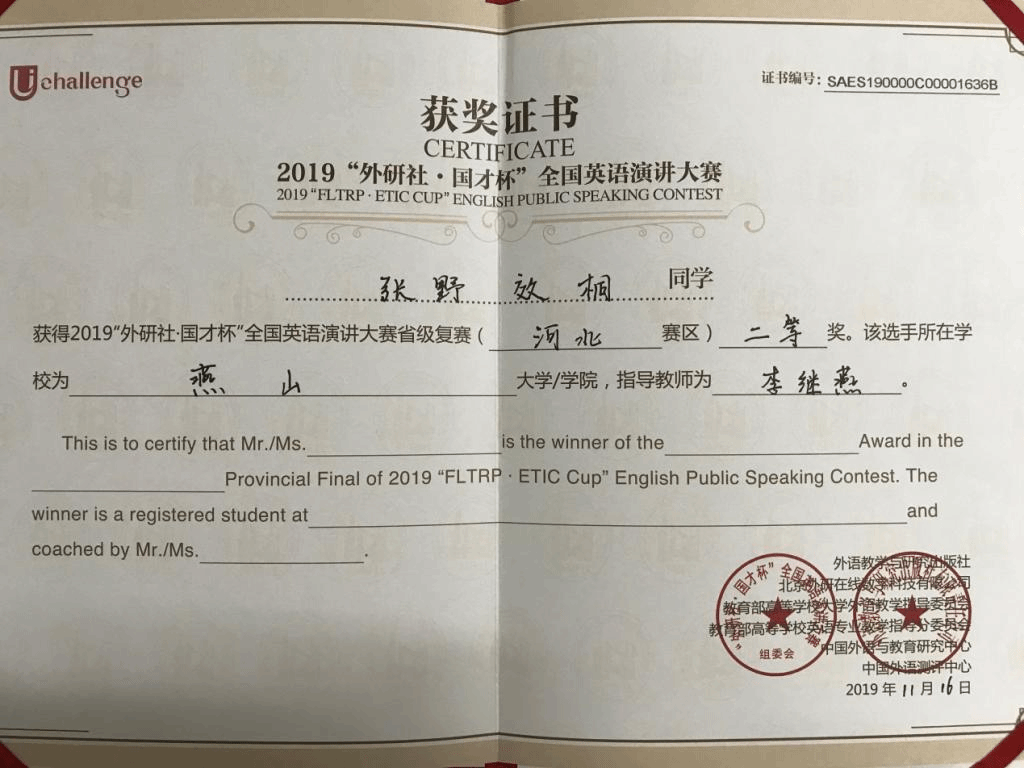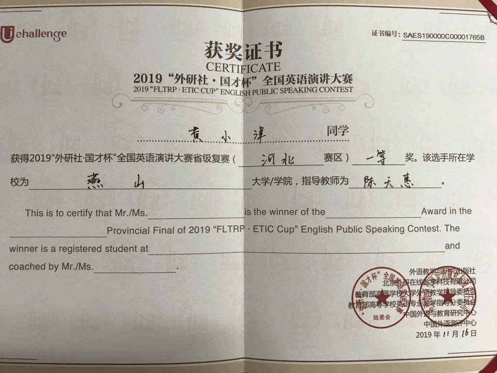 经过艰苦卓绝的准备、激烈的现场角逐,星空(中国)杜晶获得英语专业组一等奖,日语专业黄小津获得非英语专业组一等奖,电气工程学院张野效桐获得非英语专业组二等奖,燕山大学获得优秀组织奖,星空(中国)教师张宇、陈天惠、李继燕分别获得指导教师一等奖和二等奖,再创我校参加此项赛事的佳绩。