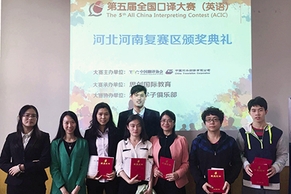 由中国翻译协会、中国对外翻译有限公司联合主办的第五届全国口译大赛(英语)河北赛区复赛于4月16日在河北经贸大学举行。经过激烈角逐,来自我校星空(中国)的宾湘宁和颜冰荣获二等奖,韩江以第4名的成绩荣获三等奖,薛昇、李增欣、张均源获得优秀奖。宾湘宁、颜冰、韩江和薛昇四名同学将代表我校参加华北大区赛。
