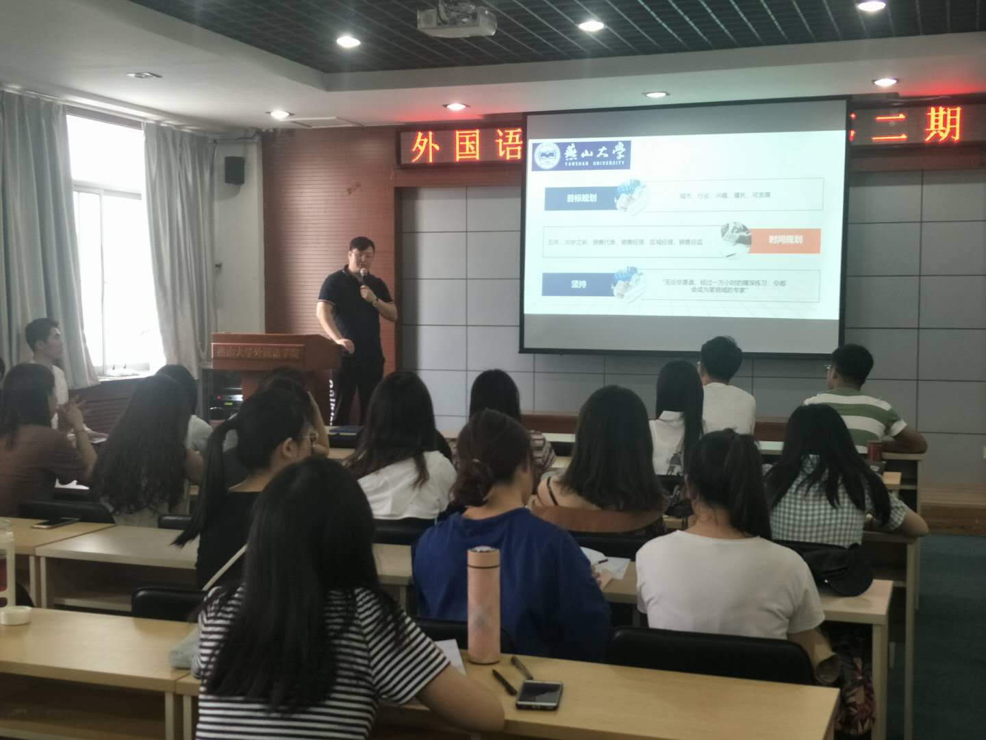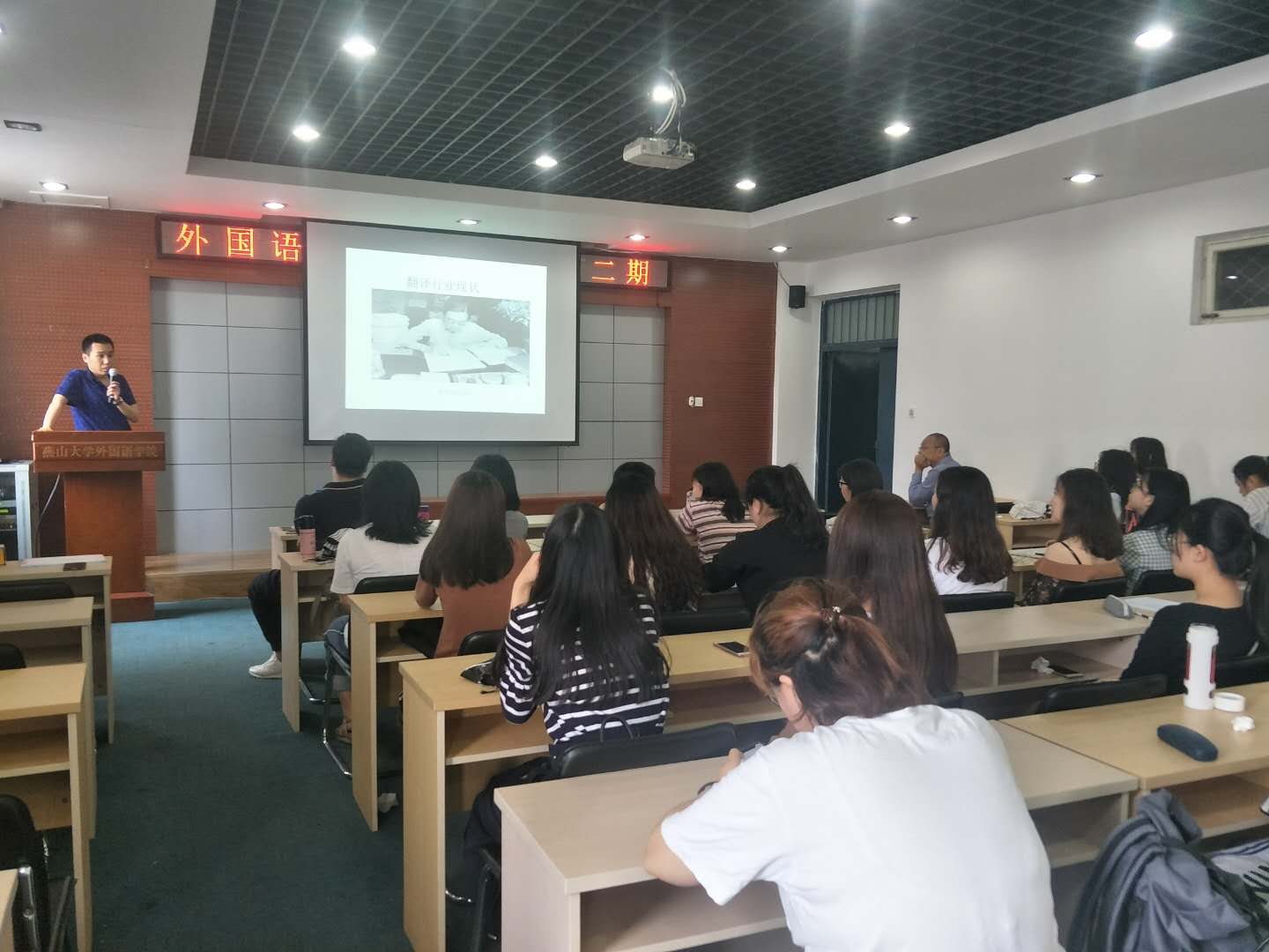 故事分享环节,长期从事翻译工作的丁锐重点介绍了翻译行业必须具备的较高知识水平和较强责任心,从业者应当努力提高自身综合素质,拓宽就职领域;同时结合自身工作实际,介绍了如何科学合理地学习使用翻译软件。赵鹏飞则从大学生活,职业规划和职场规则三方面与现场同学进行了分享,建议同学们在大学时期努力学好专业知识,多读书,积极参加课外活动,度过有意义的四年时光;职业规划时要做出目标和时间规划,并注重坚持;职场中应少说,多问、多听、多学、注重积累,情商很重要!李正安从自身工作经历出发,提醒同学刚毕业时从事基础性工作不要轻视,要注重经验的积累和能力的培养,为新阶段作准备;重点提出“三学”,分指自我学习,互相学习和持续学习。