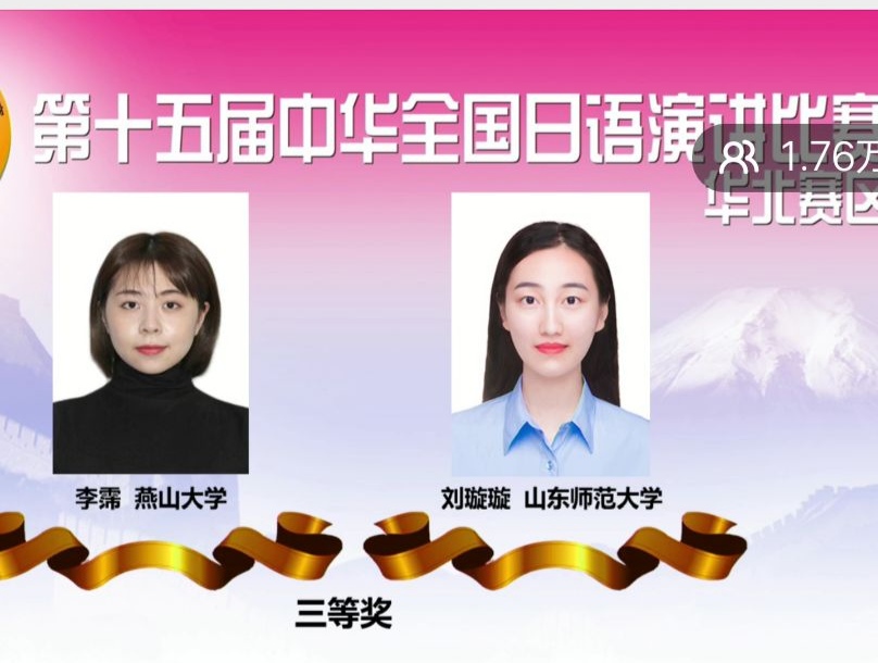 11月7日,在“第十五届中华全国日语演讲比赛”中,我校日语系选手李霈获得华北赛区三等奖,沙欢获优秀指导教师奖。