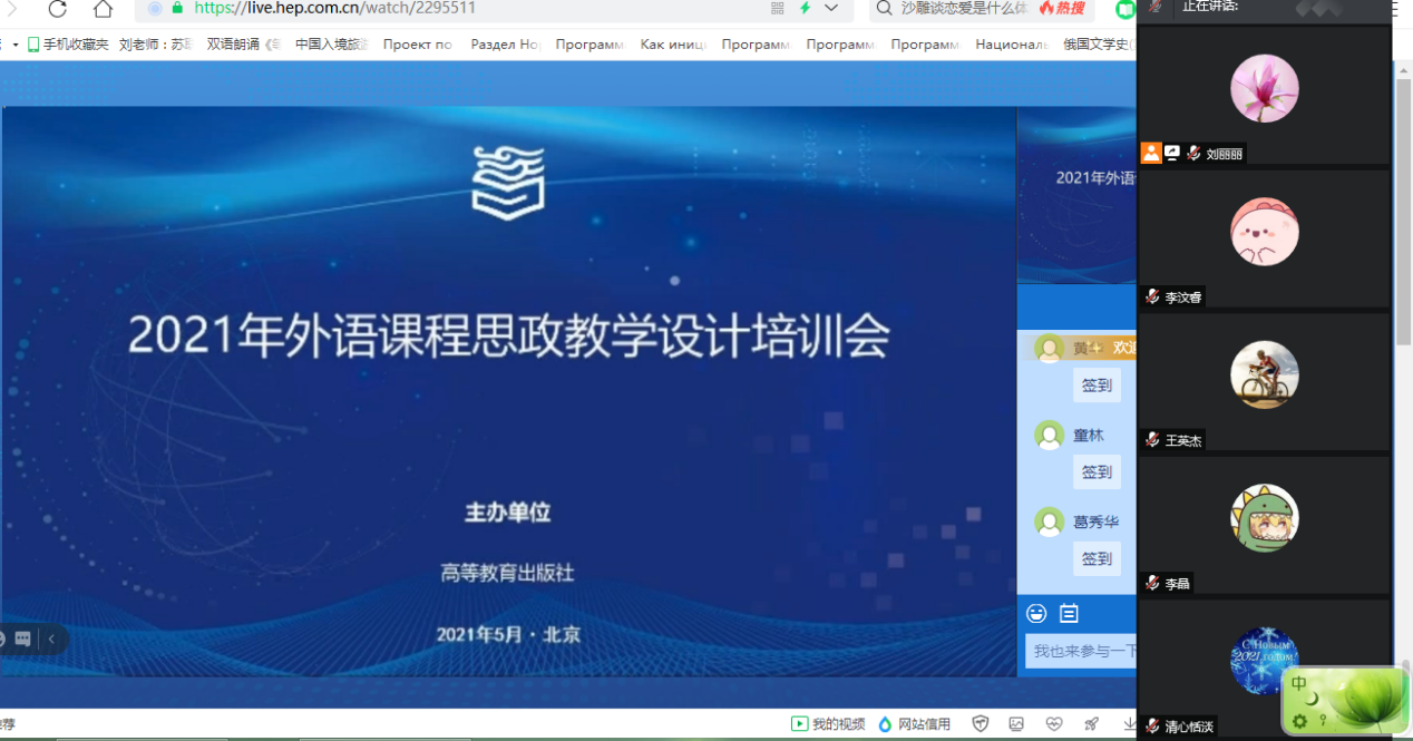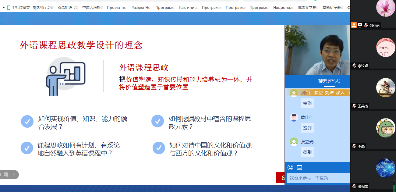 为贯彻落实全国高等学校本科教育工作会议精神,全面推进外语专业“课程思政”教学改革,切实提升我院教师“课程思政”教学能力,2021年5月20日晚,星空(中国)组织各系教师参加了由高等教育出版社组织的《2021年外语课程思政教学设计培训会》。