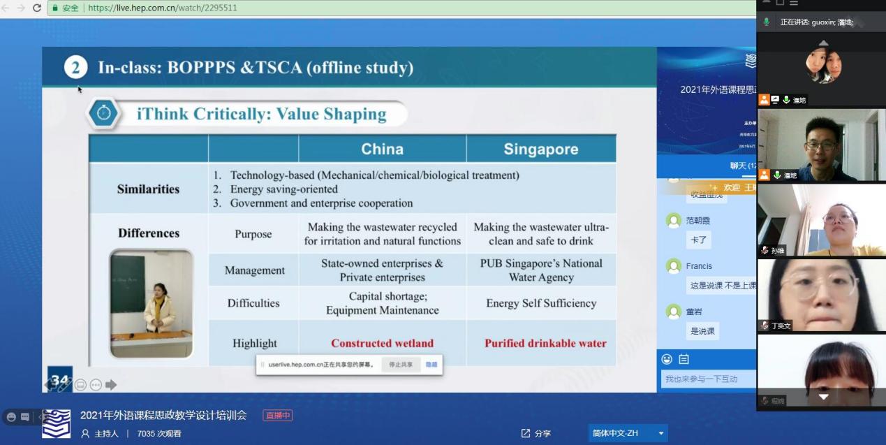 培训会上,北京科技大学的张敬源教授解读了外语课程思政教学的误区,讲解了外语课程思政教学设计的理念与原则,并介绍了思政教学的实践经验。郭薇老师分享了自己课程教学案例设计的理念、内容和做法,强调了课程思政设计时,应结合课程特点挖掘专业课程中的思政元素,并解析了如何基于BOPPPS、TSCA有效教学模式设计教学。最后,高等教育出版社胡岚从活动背景、目的、活动时间、活动形式、作品要求、评审标准等方面,对2021年外语课程思政优秀教学案例征集与交流活动进行了详细的解读。