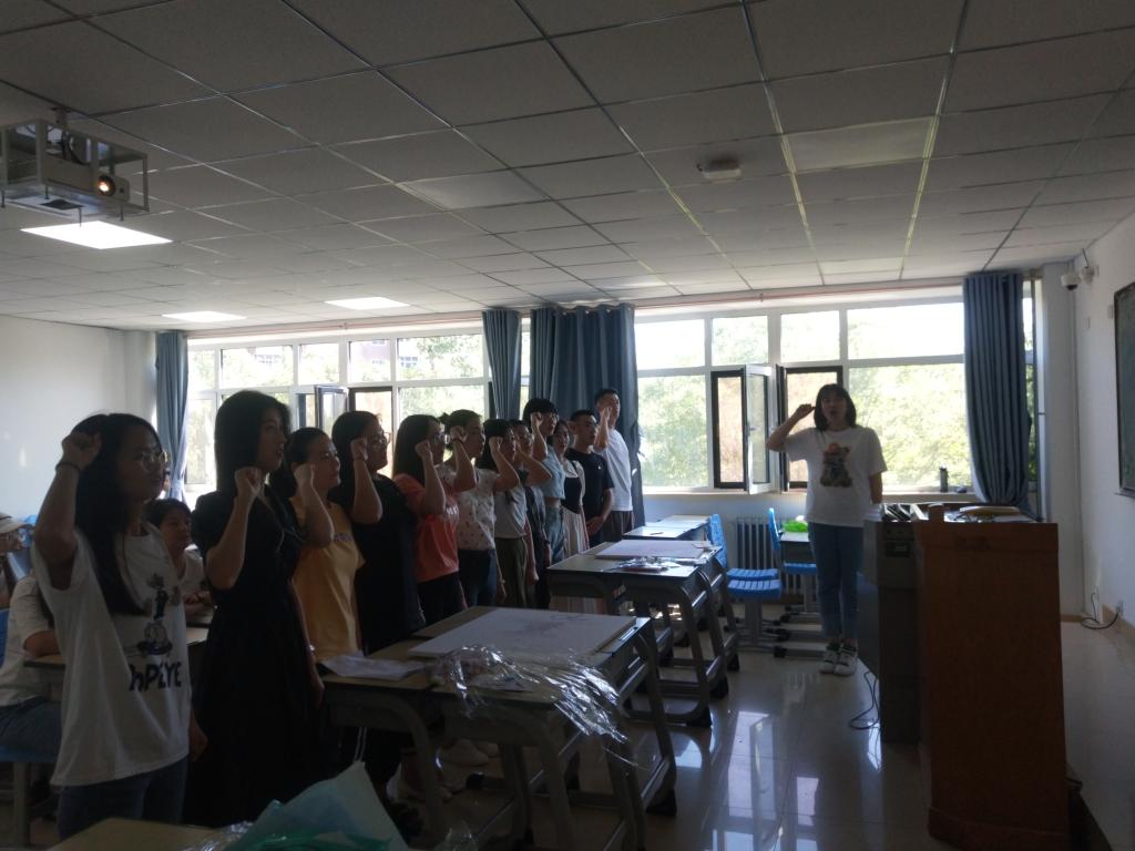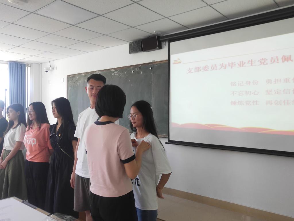 活动伊始,支部委员为毕业生党员佩戴党员徽章,希望毕业生党员们在以后的工作岗位上牢记党员身份、铭记入党初心、坚定共产主义信仰,登高望远,实力担当争先锋。随后,在党支部副书记桑美凤的带领下,毕业生党员们面向鲜艳的党旗,举起右手,重温入党誓词。