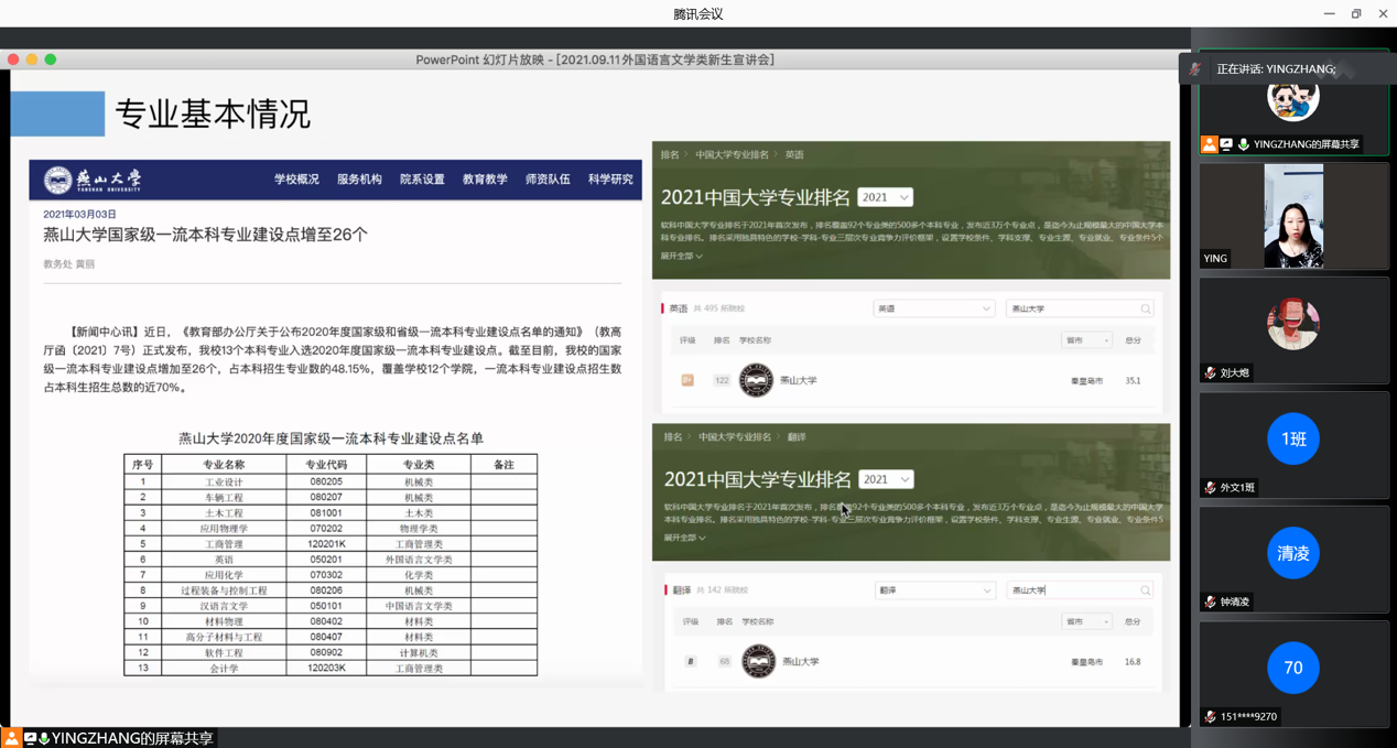 为帮助2021级外国语言文学类专业学生更快更好地适应大学生活与学习,9月11日上午,星空(中国)英语系召开了专业宣讲会。应学校疫情防控要求,减少人员聚集,此次宣讲会在线上进行。会议由英语系主任张颖老师主持,全体21级新生参加。