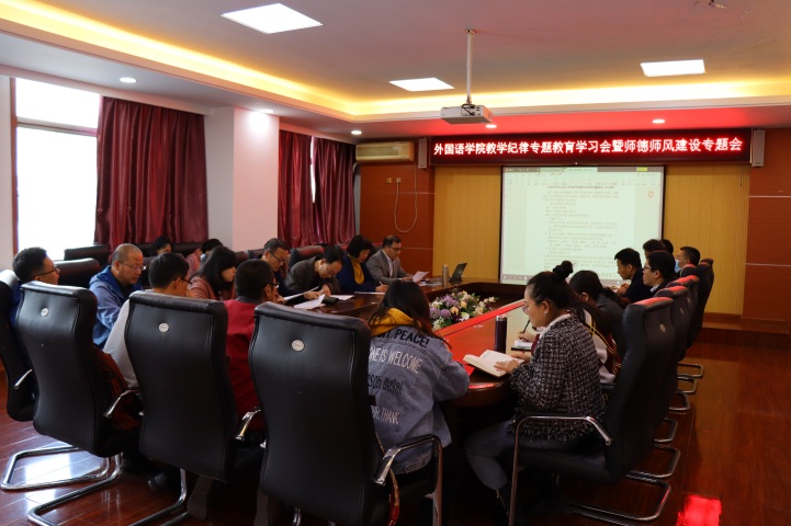 王林海院长首先做了动员讲话,强调了教学纪律学习的重要性和必要性,并要求认真组织落实。会议首先由杨搏、赵志刚、张宇三位同志就“必学内容材料”进行了认真解读。随后,郑占国副院长带领大家学习了北京外国语大学张莲教授撰写的学习习近平总书记给北外老教授回信精神的文章:《培养服务国家战略的外语人才》和习近平在中共中央政治局第三十次集体学习时强调的“加强和改进国际传播工作,展示真实立体全面的中国”两个文件。并结合自身在托利多大学孔子学院任职多年的经验,指出外语人才培养要坚持打好基本功,成为专业本领过硬的人,以能力培养为导向,重视语言运用能力、跨文化能力、思辨能力和自主学习能力的培养。最后,院党委书记胡铁巍同志作总结发言:强调教师应发挥课堂主渠道作用,向学生传递正确的世界观、人生观、价值观,传播正能量,切实增强中国特色社会主义道路自信、理论自信、制度自信、文化自信。