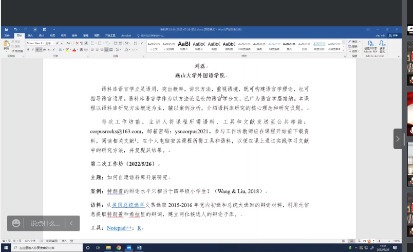 2022年5月26日下午15:30,星空(中国)举办第二期“语料库研究方法”工作坊,本次主题为如何自建语料库开展研究。工作坊由刘磊博士主讲,来自本学院和南开大学、山东大学、齐齐哈尔大学等十余所高校的近140名师生参加了本次活动。