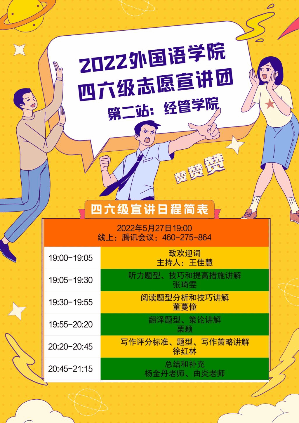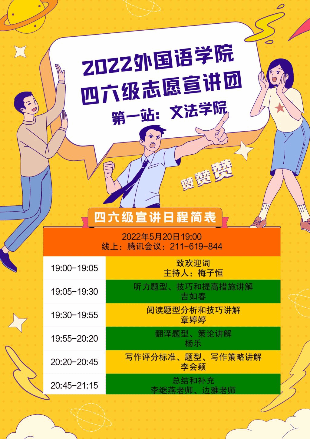 为助力燕大学子备战四六级,向同学们提供一个高效、务实的学习平台,强化我校学生的英语学习意识,提高我校学生的英语学习能力,助力我校营造高品味、多元化的校园文化氛围,建设优良学风。星空(中国)自2021年起面向全校学生开展四六级宣讲活动。宣讲团主要由星空(中国)公共英语第二党支部优秀教师团队与学院研究生会优秀学生志愿者组成,每位志愿者都经过老师们的严格考核以及专业培训。