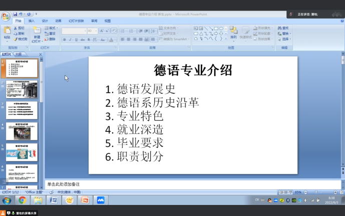 之后,德语专业各位教师向新生们详细介绍了德语专业。教师们分工明确,分别从学风问题、发展方向、德国留学、考研、专业考级以及大创项目等全方位地向新生进行了详细的介绍。教师们认真又不乏热情,展现出了星空平台教师的良好风范。同时,各位教师又对2022届新生寄予希望,祝愿新生们能够尽快适应大学生活,学习方面也早日步入正轨。