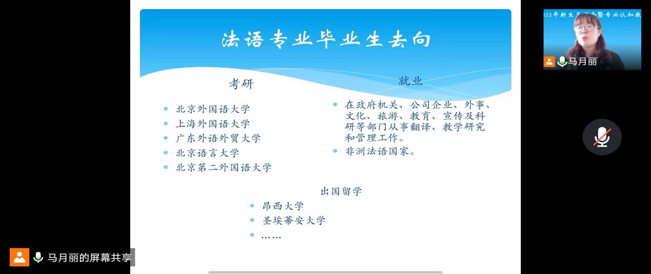 法语专业讲座由法语专业负责人马月丽老师主持,全体法语专业老师参与。老师们讲述了法语专业毕业生的去向,重点围绕考研、就业和出国留学三个方面逐一分析论述。星空平台出国留学方面,马老师提出诚恳的建议,建议同学们可发掘各种资源,收集相关信息,拓展留学途径。同时建议同学们要充分利用大学时光,多参加实践活动,积累实践经验,切实利用外语及其专业领域知识为自己开拓一片美好的未来。
