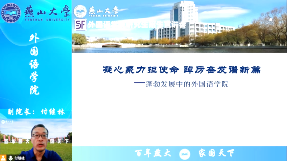 招宣会首先由副院长郑占国主持开场,副院长付继林随后从学校概况、学院简介等方面做了简要介绍,涵盖学院学科发展、人才培养、导师队伍、科研成果、学术交流、招生计划等方面。随后英语系系主任张颖和日语系系主任刘洪岩分别就各自学科招生方向发展情况进行了详细的介绍。在接下来的答疑环节中,招宣小组针对考生提出的问题采取平台上实时留言区回复和面向全体考生音视频回复双线作战的方法做了详尽的解答。融通中外,语简情长,宣讲会在圆梦燕大,相约燕园,预祝同学们顺利上岸的祝福中圆满结束。