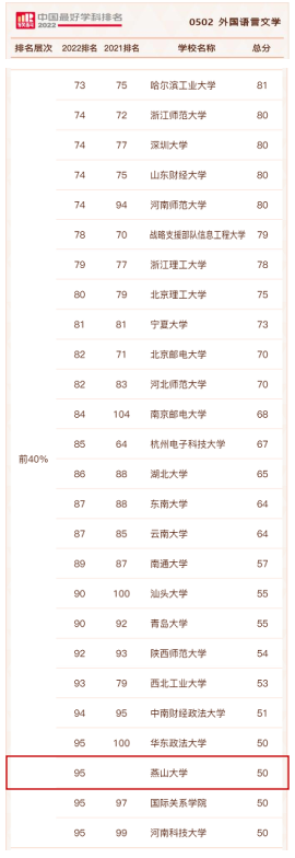 本次软科排名,外国语言文学学科全国共有120所大学上榜,河北省仅有燕山大学和河北师范大学两所高校上榜,标志着我校外国语言文学学科建设上了一个新台阶。本次软科排名取得好成绩,极大增强了我院全体师生搞好学科建设的信心,提振了全身心投入学科建设的士气。星空(中国)将从人才培养、科研项目、成果获奖、学术论文、学术人才等五个方面继续深入做好外语语言文学学科建设,凝心聚力担使命,踔厉奋发谱新篇。