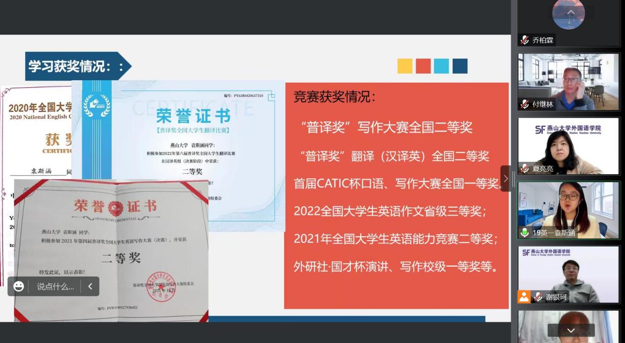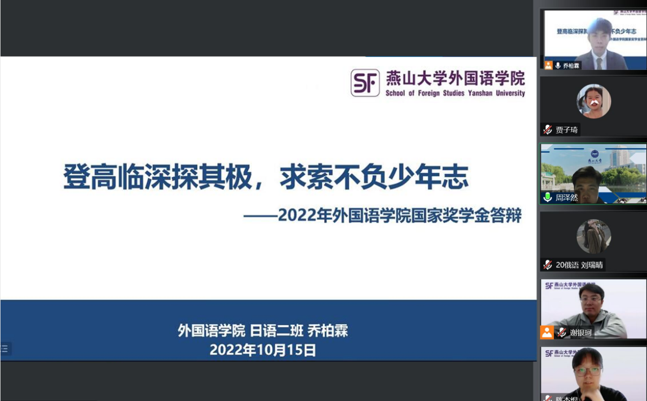 本次国奖答辩共有来自学院三个年级的7名候选学生参选,同学们通过PPT展示、现场演讲的方式,从思想政治、学业成绩、学科竞赛、文体竞赛、社会实践等方面进行陈述。他们自信激扬的展示获得现场评委和师生的一致好评,整场答辩会气氛热烈、井然有序,在场的学生都为答辩同学的优秀事迹所鼓舞。最终,经过委员会成员评审,拟推荐2019级英语1班袁斯涵和2020级日语2班乔柏霖两位同学为星空(中国)国家奖学金获得者。